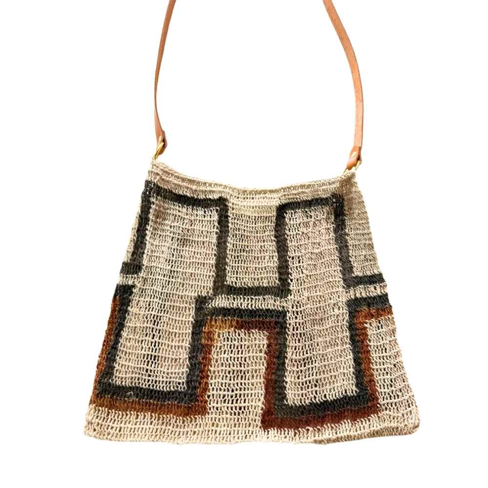 An authentic, traditional natural bilum with a modern twist. Bilum and Bilas have added an elegant leather strap to this heritage bilum for a polished and refined look for the discerning woman.